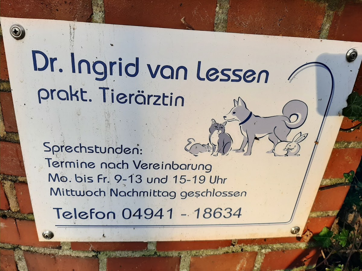 Frau Dr., van Lessen ist eine begnadete Tierärztin. Sie hat 16 Jahre unseren Hund liebevoll betreut und jetzt schon 14 Jahre meine Katze. Egal was man fragt, Frau Dr. van Lessen nimmt sich Zeit und man hat das Gefühl nicht allein gelassen zu werden. Ich kann diese gute kompetente Tierärztin nur weiter empfehlen!!!