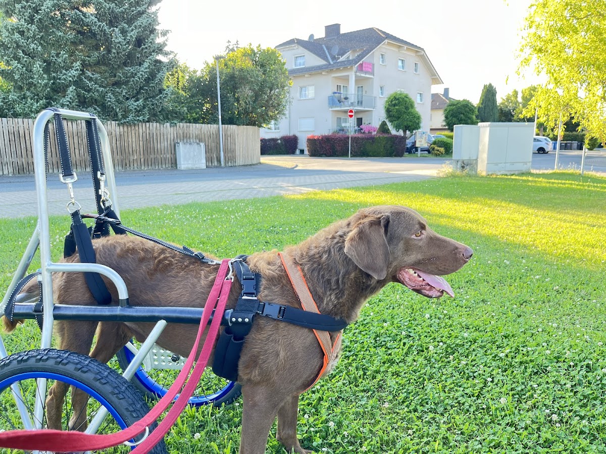 Unser knapp 4-jähriger Chessie hatte Ende Mai einen schweren Bandscheibenvorfall und zeigte sofort eine komplette Lähmung der Hinterläufe. Nach der akutesten Phase waren wir zum Ausmessen des Rollis bei Herrn Strieder und seinem Team. Alle waren sehr freundlich, offen und im Umgang mit unserem Hund einfach super! Der Rolli war nach gut 3 Wochen da und nun sind wir wieder mobil. Chesmu hat ihn sofort gut angenommen. Tolle Verarbeitung, einfaches Händling, auch mit einem großen Hund. Der Rolli ermöglicht uns wieder eine physische und mentale Auslastung und beeinflusst auch die noch fortlaufende Reha sehr postitiv. Vielen Dank für die Unterstützung und Begleitung auf unserem Weg zurück zu einem "normalen" Hundeleben!