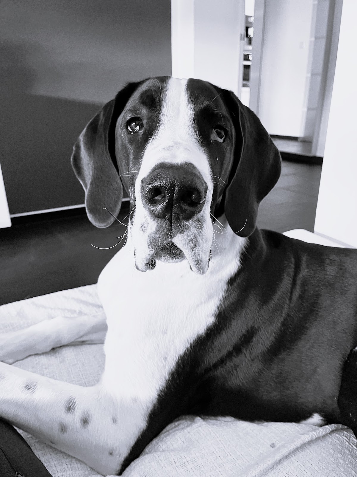 Wir haben eine Deutsche Dogge und sind schon seit Anfang an in dieser Praxis. Wir dürfen im Wartezimmer üben, damit er lernt entspannt zu warten und das Tierarztbesuche „nichts Besonderes“ sind.