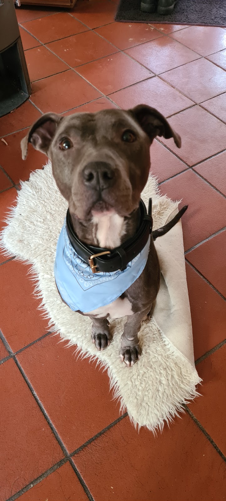 Unser Lui, kleiner grauer Amstaff aus dem Tierschutz, gerade aus Ungarn angereist, hat sich vom Fleck weg direkt in diese Tierärztin verliebt. 🥰
