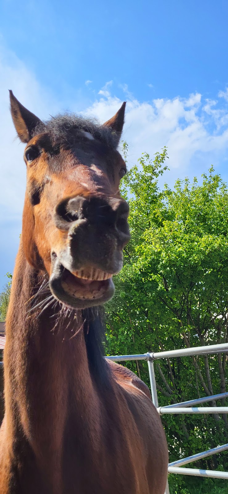 Leider ist der Opi kurz danach beim Toben in der Halle gestürzt. Ein paar Tage später konnte er nicht einmal mehr Gras fressen ohne extreme Röllchen zu machen. Vom Heu und Stroh will ich gar nicht sprechen. Ich habe Anne angeschrieben und selbst aus ihrem Urlaub eine Rückmeldung bekommen. Sie kam dann sofort nach ihrem Urlaub und hat nach ihm geschaut. Die Behandlung war super, alles toll erklärt und auch hier "pro Pferd" (es war sehr warm und schon Mittag, da wollte sie ihn nicht unnötig sedieren). Er war bei der Untersuchung zum Glück sehr kooperativ und sie konnte alle Zähne ohne Maulgatter abtasten. Alle da wo sie hingehörten, keiner wackelte. Die Empfehlung zunächst mit Schmerzmittel zu arbeiten war absolut das richtige. Schon am nächsten Tag meinte ich eine Besserung im Fressverhalten zu bemerken. Am dritten Tag konnte er grasen ohne Röllchen. Inzwischen geht auch Heu wieder.