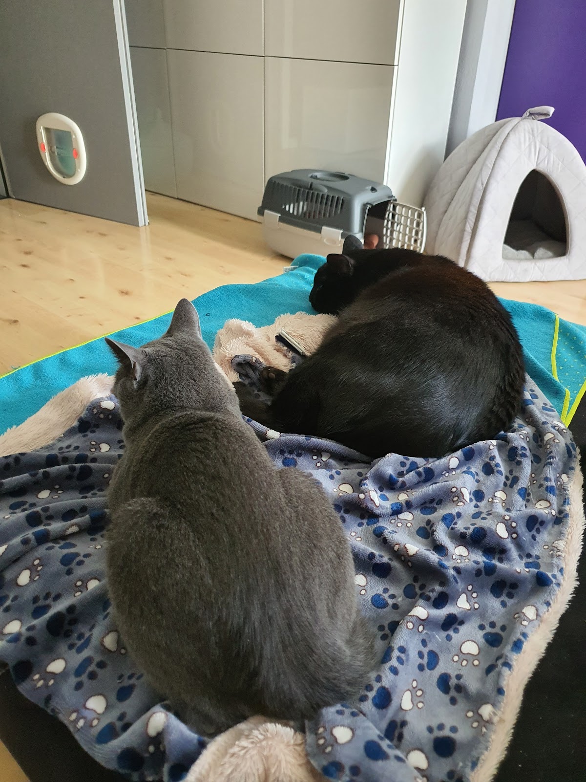 Auch heute in der Praxis wurden wir nicht enttäuscht. Die Katzen bekommen auf einem Katzenparkplatz (Tisch) im Wartezimmer zunächst eine Decke mit Feliway Pheromonen übergelegt um sich zu beruhigen. Im Behandlungszimmer dürfen sie dann erstmal alles erkunden bevor es losgeht.