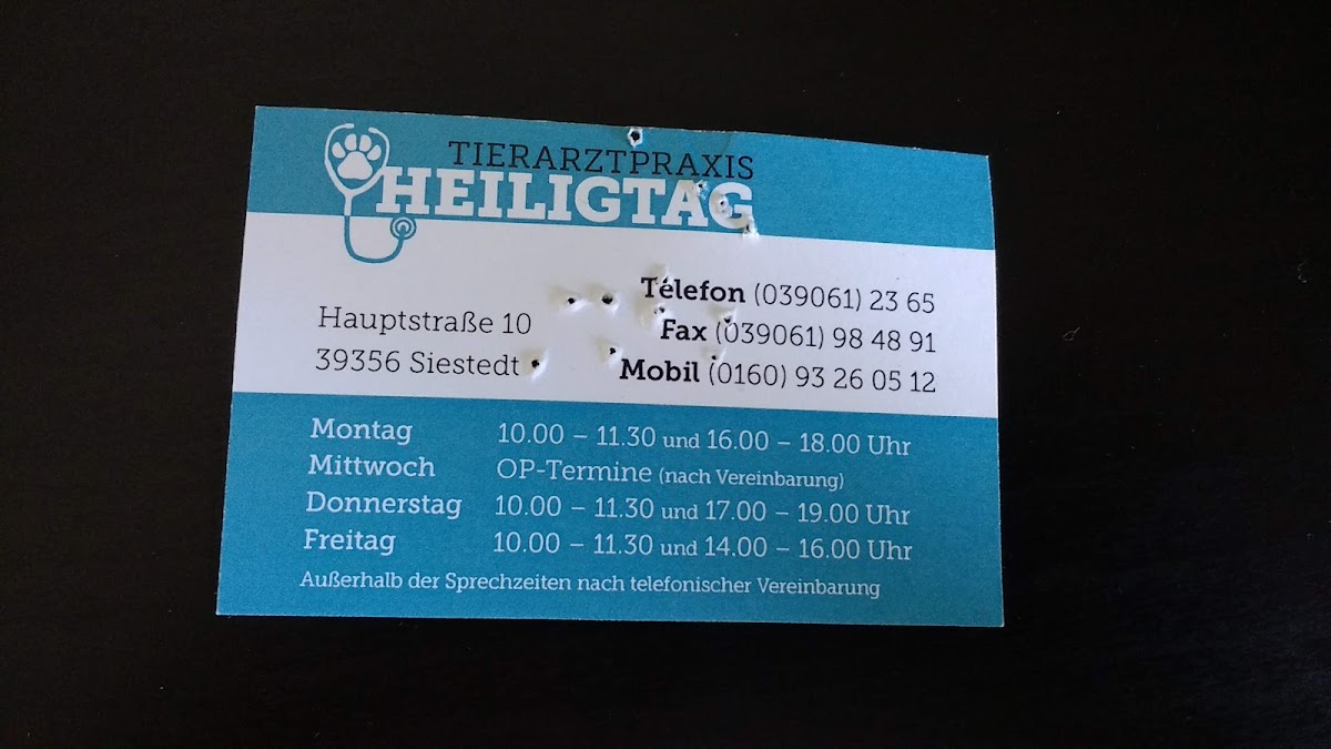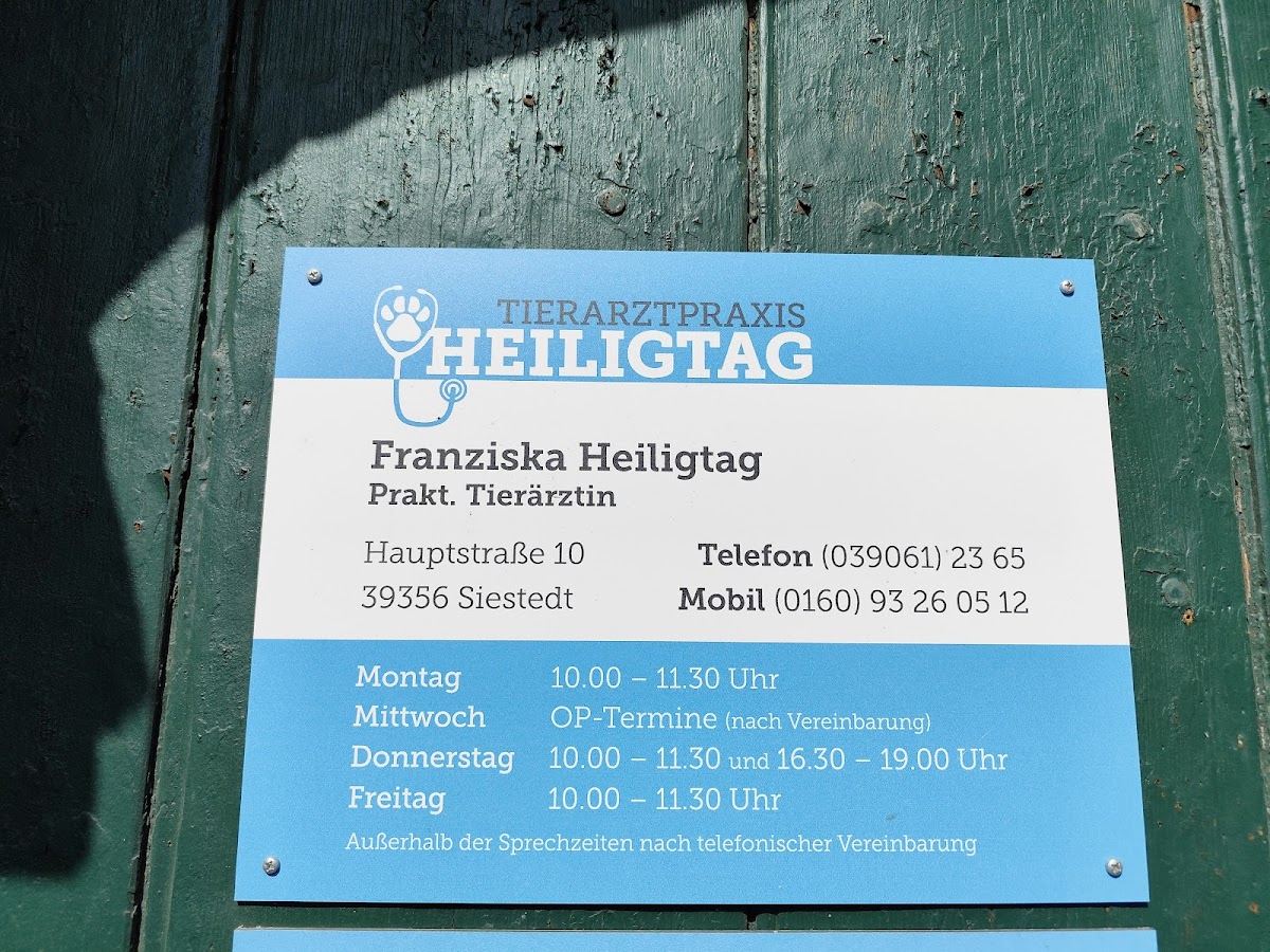 Seid über 25 Jahren sind wir schon bei der Tierarzt Praxis Heiligtag in Siestedt. Wir können nur positives Berichten.😃 Immer ein offenes Ohr und sehr gute Behandlung. Es wird sich viel Zeit für das Tier genommen und die Behandlungskosten halten sich im unteren Rahmen. Die Tochter knüpft an die Kompetenz und dem Sachverstand ihres Vaters kompromisslos an. Solche Tierärzte sind leider nur noch sehr selten zu finden. An dieser Stelle nochmal Danke für die jahrelange Behandlung unserer Tiere!👍🏻